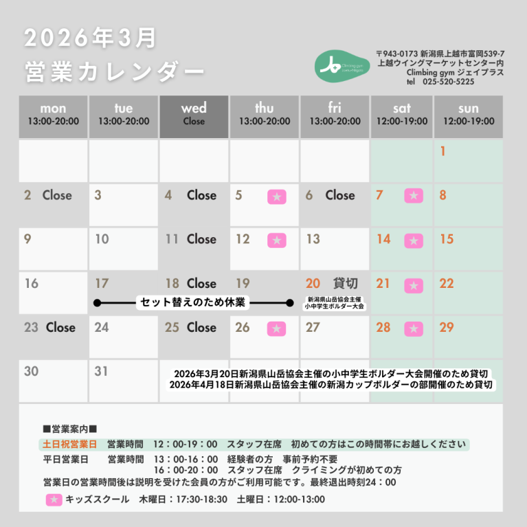 ■3月20日(金祝)は新潟県山岳協会主催の小中学生ボルダー大会が開催されるため貸切となります。見学は可能です。