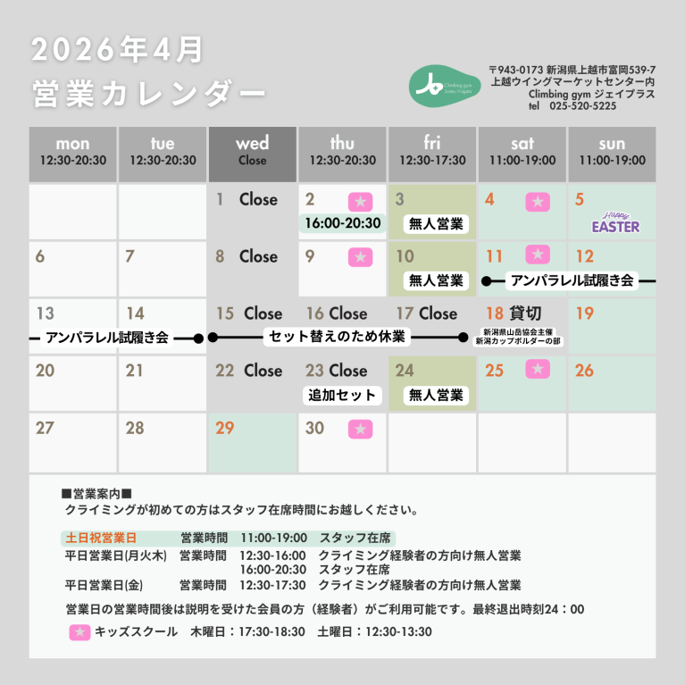 ■4月18日(日)は新潟県山岳協会主催の新潟カップボルダーの部開催のため貸切となります。見学は可能です。